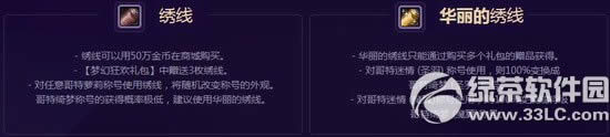 温馨提示: - 绣线、华丽的绣线可以交易,2015年6月18日凌晨6点删除。 - 封装的哥特萝莉称号使用绣线后称号已改变的同样为封装状态, 解除封装后哥特萝莉称号使用绣线后,变更后的称号也是解除封装的状态。 - 称号礼盒只在【梦幻狂欢礼包】。 纹章