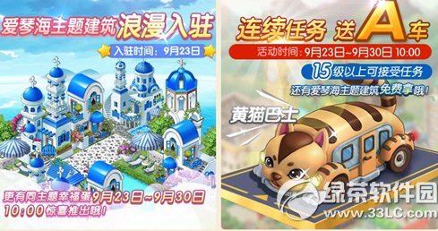 【活动二:“爱琴海”主题建筑第一季上架】 活动时间:2014年9月23日 活动规则:爱琴海之旅正式起航,第一季精彩建筑已经上架,爱琴海图书馆、假日帽摊、珊瑚邮筒、爱琴海盆栽、海蓝路灯、爱琴海民居、爱琴海地砖、海风帐幔、白色九重葛、紫色九重葛、爱琴海圆亭、爱琴海橄榄树,用魅力和轻松点缀你的小镇吧!