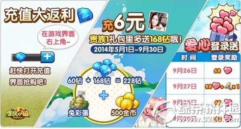 【活动三:“海蓝灯塔”幸福蛋登场】 活动时间:2014年9月23日-9月30日10:00 活动规则:爱琴海风格袭来,国庆畅想正式起航,假日海滩上有海蓝灯塔的守望,有爱琴海民居的古朴,有珊瑚邮筒的神秘,有威尼斯兰舟的静谧。爱琴海之蓝海灯塔幸福蛋等你砸出惊喜。 【活动四:登录倒计时,爱心不停歇】 活动时间:2014年9月26日-9月29日23:59 活动规则:《全民小镇》登录有礼,活动期间,镇长每日上线即可收获爱心奖励及幸运砸蛋锤哦!全民倒计时,当领取全部登录奖励之后,国庆长假就快要开始咯! 9月26日 68爱心 9月27日 88爱心+砸蛋锤*1 9月28日 68爱心 9月29日 68爱心