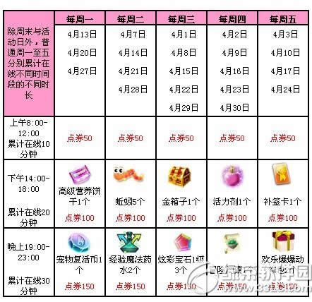 【周一至周五累计在线】 除了特别节日外,本月每周一至周五,上午8点至12点期间累计在线10分钟可获得50点券。下午14点至18点期间累计在线20分钟可获得100点券与小礼品。晚上19点至23点期间累计在线30分钟可获得150点券与热门道具。每天300点券轻松抱回家!