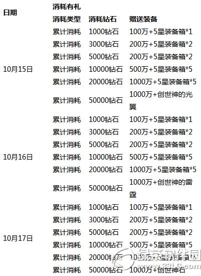活动七: 消耗有礼 活动时间:10月15日00:00—10月17日23:59 参与区服:全服 活动内容: 活动期间玩家累计消费钻石达到指定额度,即可在活动中心领取大量五星装备箱和金币,最高档次会送出创世神装备哦。每个档次每日限领取一次。