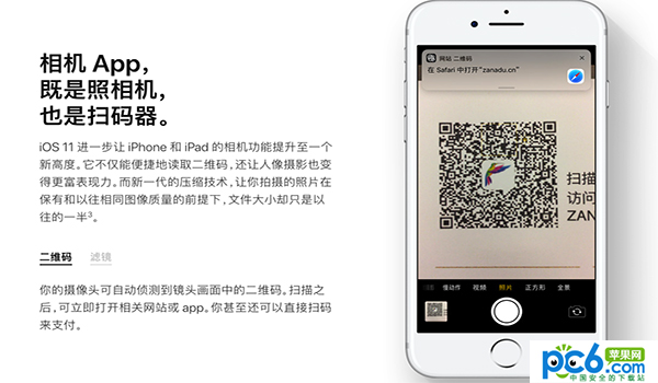 相机和照片app 支持读取二维码,新增的各种专业级滤镜,支持 HEVC 编码拍摄,高压缩率的视频拍摄,减少照片与视频的文件大小,减少空间占用但质量不减,同体积更清晰。人像模式将支持拍摄光学防抖、HDR 和闪光灯下的照片。在照片 app 中,回忆里面增加了更多不同类别相册的自动创建, Live Photo 增加循环、来回播放和长曝光模式。