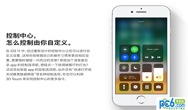全新控制中心和锁屏界面 原本的控制中心得到了重新设计,占据的空间更大,但更加方便,将大量快捷功能按照多区域划分,支持自定义设置,支持 3D Touch。你可以将各种 app 加入控制中心,快速开启或关闭移动蜂窝数据也已经支持。锁屏界面新增更快捷查看通知的方式,从屏幕顶部向下拉即可进行更多操作,包括查看最近收到和未读的通知。