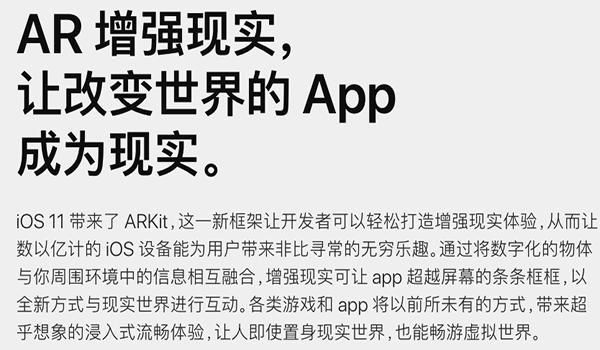AR 体验是 iOS 11 的一大更新,为此苹果推出了 ARKit 全新平台,方便开发者使用内置的摄像头、处理器和运动传感器在 iOS 设备上开发 AR 体验的应用和游戏。苹果表示,AR 是一种建立在真实世界的视觉技术,能够带来互动游戏或者身临其境的沉浸式体验。另外,苹果还发布了针对 iOS 人工智能的 Core ML 接口,开发者可利用机器学习来创建各种更智能的应用。 发布日期和支持设备,iOS 11 支持多款设备升级。iPhone 包括 iPhone 7、iPhone 7 Plus、iPhone 6s、iPhone 6s Plus、iPhone 6、iPhone 6 Plus、iPhone SE 和 iPhone 5s。iPad 包括 iPad Pro 12.9 一二代、 iPad Pro 10.5、iPad Pro 9.7、iPad Air 2、iPad Air、新第五代 iPad、iPad mini 4、iPad mini 3 和 iPad mini 2。最后还支持第六代 iPod Touch。 iOS 11 开发者预览版即日起提供,公测版在 6 月底提供,正式版今年秋季推送。 苹果应用引领新的上网速度革命,给您带来超快体验。 |