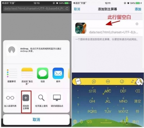 点击【创建】后软件会自动跳转到Safari浏览器,从Safari浏览器的最下方的【分享】中选择【添加到主屏幕】,注意标题一行留空。