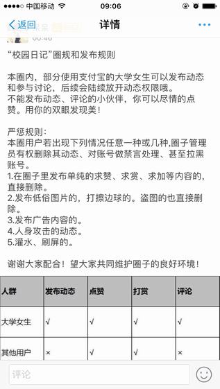 1、支付宝生活圈是什么? 生活圈是为拥有共同爱好的人提供交流的社区,在这里你可以分享你的生活,与兴趣相投的人进行互动交流,也可以享受生活圈运营者提供的服务。目前处于陆续开放中。 2、怎么搜索其他的生活圈? 因为生活圈目前是定向邀请,无法通过搜索查找已上线但未加入的生活圈哦 温馨提示:您可以加入首页卡片给您推送的生活圈,或通过扫描他人分享的生活圈二维码加入 3、怎么加入支付宝生活圈? 生活圈分两种: 1、一种是开放型生活圈,即只能通过系统推荐加入(无其他加入入口); 2、另一种是封闭型生活圈,除了可通过系统推荐加入以外,还可以通过生活圈成员分享该生活圈内右上角“生活圈信息”里的二维码邀请其他人加入。 小编在还没有正式支付宝正式重大更新之前就被邀请到“简七理财”生活圈,确实如客服结识,是一群有共同爱好的人一起加入一个圈子,讨论自己干兴趣的事,(小编平时买买基金玩) 然而在这次推出的“校园日记”生活圈之后,支付宝的生活圈正式进入大众眼中,现在几乎各地都会出现一个女人频道吧,以城市名命名的生活圈,如长沙就是“长沙女人”。 之所有备受网民讨论,是因为这些圈子都有一定的要求,一些内容也是不堪入目,以“校园日记”为例,只有在校女大学生才可以发布动态。不能发布动态的用户可以点赞和打赏,芝麻信用分750 分以上(包含750)的用户才有评论权限。