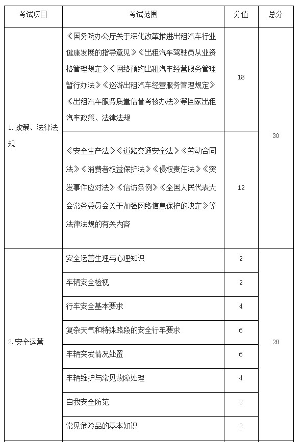 那么具体>>网约车考试内容是什么 网约车考试大纲<<是那些呢?PC6苹果网小编就和大家一起来仔细解读一下! >>网约车考试内容是什么 网约车考试大纲<<根据大纲,所有传统的出租汽车驾驶员从业资格全国公共科目考试实行全国统一考试大纲。考试方式实行全国统一题库,采用计算机系统随机抽题的方式考试。考试时间60分钟。考试试题共85道题,题型分为判断题、单项选择题和多项选择题。考试总分100分,80分及以上为考试合格。 以上是出租车的考试是规定,所有的网约车和出租车驾驶员也是一样的规定都必须要参与同样的考试。 网约车考试大纲具体的考试内容有掌握出租汽车相关政策、法律法规;掌握出租汽车安全运营知识;理解出租汽车驾驶员职业道德;掌握出租汽车服务标准规范;熟悉出租汽车运营其他相关知识。其中,对新政的考试内容占比最多,达到18分。 同时网络预约出租汽车驾驶员具体考试内容还必须要为地方出租汽车政策法规等具有区域规范要求的知识。交通运输部也提到,与巡游车驾驶员相比,修订后的规定最大限度简化了网约车驾驶员考试内容,并规定其注册及注销,可通过平台公司向发证机关所在地出租汽车行政主管部门报备来完成等。 但根据《规定》,参加网络预约出租汽车驾驶员从业资格考试也有一定申请门槛,分别是:取得相应准驾车型机动车驾驶证并具有3年以上驾驶经历;无交通肇事犯罪、危险驾驶犯罪记录,无吸毒记录,无饮酒后驾驶记录;最近连续3个记分周期内没有记满12分记录;无暴力犯罪记录;城市人民政府规定的其他条件。 同时,交通运输部对网络预约出租汽车服务许可证件的式样也进行了明确。根据规定,《网络预约出租汽车经营许可证》分正本、副本,制作要求比照《道路运输经营许可证》要求。 为规范出租汽车驾驶员从业资格全国公共科目考试,提高出租汽车驾驶员综合素质,根据《交通运输部关于修改<出租汽车驾驶员从业资格管理规定>的决定》(交通运输部令2016年第63号)等有关规定,制定本大纲。 总结起来的话,网约车驾驶员必须要和出租车驾驶员一样参与驾驶员考试,同时网约车驾驶员还必须要满足当地政府的加网络预约出租汽车驾驶员从业资格考试也有申请门槛。 网约车驾驶员考试大纲详细内容: 一、适用范围 本大纲适用于在中华人民共和国境内,申请从事出租汽车客运服务的驾驶员。 出租汽车驾驶员从业资格全国公共科目考试实行全国统一考试大纲。 二、考试组织 交通运输部负责指导全国出租汽车驾驶员从业资格全国公共科目考试工作。 各省、自治区交通运输主管部门负责指导本行政区域内出租汽车驾驶员从业资格全国公共科目考试工作。 直辖市、设区的市级出租汽车行政主管部门组织实施本行政区域内出租汽车驾驶员从业资格全国公共科目考试工作。 三、考试方式及要求 (一)考试方式实行全国统一题库,采用计算机系统随机抽题的方式考试。 (二)考试时间60分钟。 (三)考试试题共85道题,题型分为判断题、单项选择题和多项选择题,其中判断题15题,每题1分;单项选择题55题,每题1分;多项选择题15题,每题2分。 (四)考试总分100分,80分及以上为考试合格。 (五)每场考试应当不少于2名考核员,考试成绩必须由2名考核员签字确认。考试成绩应在考试结束10日内公布。 四、考试内容及要求 (一)掌握出租汽车相关政策、法律法规。 (二)掌握出租汽车安全运营知识。 (三)理解出租汽车驾驶员职业道德。 (四)掌握出租汽车服务标准规范。 (五)熟悉出租汽车运营其他相关知识。 五、考试内容及分值分配