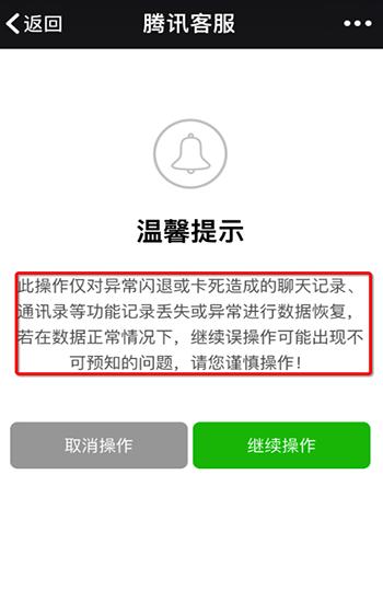 注意事项:此方法的操作仅对异常闪退或卡死造成的聊天记录、通讯录等功能记录丢失或异常进行数据恢复,若在数据正常情况下,继续误操作可能出现不可预知的问题,所以要谨慎操作!