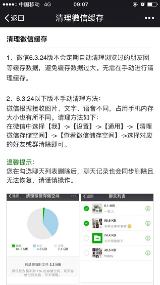 导读想和朋友分享您喜欢的苹果应用? 我想发上微博该是个不错的主意, 更高效的应用平台:App Store浏览太麻烦? 没法找到高质量的应用? 下载苹果应用大全 省时!省力!!省心!搜索功能强大,搜索结果... 想和朋友分享您喜欢的苹果应用? 我想发上微博该是个不错的主意, 更高效的应用平台:App Store浏览太麻烦? 没法找到高质量的应用? 下载苹果应用大全 省时!省力!!省心!搜索功能强大,搜索结果优先列出限免软件和免费软件。 新版微信怎么清理缓存,新版微信怎么清除缓存,微信每隔一段时间就会更新,或优化体验或推出小功能,最近的一次更新很多用户发现清理缓存这个功能不见了,其实微信团队并没有把它去除,只是隐藏得更深了,就让小编带着你重新找回这个非常实用的功能吧。 小编微信近日更新到iPhone版V6.3.27时发现原有的清除缓存空间功能已被移除,取而代之的是: 微信6.3.24以上版本会定期自动清理浏览过的朋友圈等缓存数据,避免缓存数据过大。无需在手动进行淆理缓存。 6.3.24以下版本手动清理缓存方法: 在微信中选择【我】-【设置】-【通用】-【清理微信存储空间】-【查看微信储存空间】-选择对应的好友或群清理即可。 你在勾选聊天列表后,聊天记录也会同步删除且无法恢复,请谨慎操作。