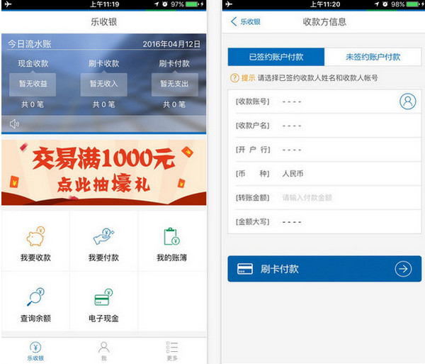 乐收银有什么功能? 1、商户收款;即:下游客户在民生银行签约商户的乐收银终端刷卡,资金直接计入商户在民生银行开立的个人结算账户。使用“乐收银”,您可以做到实时收款、实时到账、货款实时可用; 2、商户付款;即:民生银行的签约商户通过乐收银终端,将进货款从商户结算账户中汇入到预先签约的对方收款账户中; 3、余额查询;即:通过乐收银终端,刷卡并输入密码查询账户可用余额。 苹果应用引领新的上网速度革命,给您带来超快体验。 |