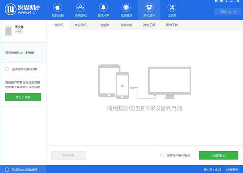 二、大家还可以用爱思助手进行升级 1、首先下载安装最新版爱思助手,用数据线把设备连接电脑;点击上方“刷机越狱”进入到“一键刷机”界面。连接成功会自动匹配固件。(如果设备状态提示连接超时可以把设备进入恢复模式或DFU模式,连接后也会自动匹配固件并且可以刷机)