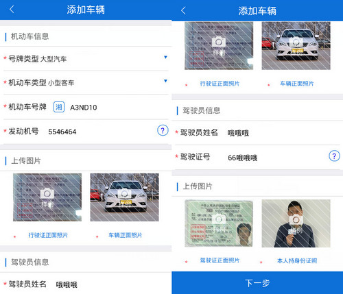 2.进入后,先点击添加车辆,进入后完善机动车信息和绑定驾驶证
