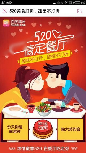 导读想和朋友分享您喜欢的苹果应用? 我想发上微博该是个不错的主意, 更高效的应用平台:App Store浏览太麻烦? 没法找到高质量的应用? 下载苹果应用大全 省时!省力!!省心!搜索功能强大,搜索结果... 想和朋友分享您喜欢的苹果应用? 我想发上微博该是个不错的主意, 更高效的应用平台:App Store浏览太麻烦? 没法找到高质量的应用? 下载苹果应用大全 省时!省力!!省心!搜索功能强大,搜索结果优先列出限免软件和免费软件。 百度糯米520情定餐厅怎么玩?百度糯米520情定餐厅玩法介绍。5月20日是一个特别是日子,很多情侣都选这天结婚,表示这我爱你,百度糯米特别为广大情侣朋友们举行了百度糯米520情定餐厅,让你在甜蜜恋爱的同时还享受丰富折扣礼品,那么百度糯米520情定餐厅怎么玩?让小编告诉大家百度糯米520情定餐厅玩法吧! 1、用户打开百度糯米后,点击上方的520情定餐厅