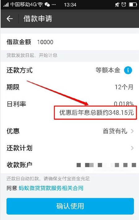 3、接下来输入你需要的借款金额以及还款方式,期限还款计划等信息。然后再点击【确认使用】