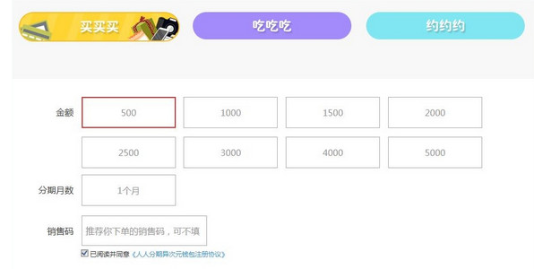 先为大家介绍一下"异次元钱包"说明: 1. "异次元钱包"业务申请流程说明: 选择金额及分期月份>>填写认证信息>>打款到绑定银行卡>>款项到账,按时还款。 2. "异次元钱包"业务受到大量同学的欢迎,但目前还有未照顾到的学校和部分高年级的毕业生,请稍安勿躁并见谅。 3. "异次元钱包"业务目前每位同学只限申请一次(说明:还款完成的同学可再次申请),如有问题可拨打客服电话咨询。 人人分期异次元钱包审核要多久?人人分期异次元钱包多久到账? 1、用户进入人人分期官网的异次元钱包页面后,就可以发现异次元钱包里包括“买买买”、“吃吃吃”、“约约约”。用户可以选择借款金额、分期月数,然后以点击下方的“马上拿钱”