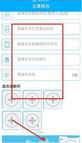 3、在主播报名界面看,输入关联房间号,支付宝真实新密,关联微信手机号,支付宝账号,身高,添加靓照,点击提交并等待审核按钮。