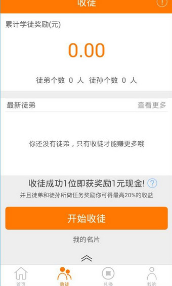 4、在收徒页面,用户成功收徒1位即奖励1元现金,并且徒弟和徒孙做任务奖励你可得最高20%的收益。