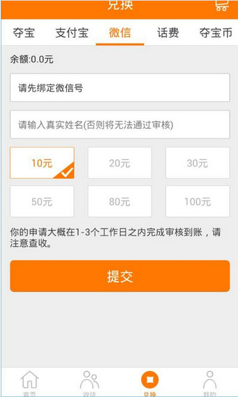 2、点击支付宝,输入支付宝帐号、收款人姓名以及提现金额,然后点击提现即可; 注:提现最低额为10元,申请提现后大概在1-3个工作日之内完成审核到账(节假日顺延),请确保你的账户已经实名认证,否则不能转账。 3、点击微信,提现需要先绑定微信号,然后输入真实姓名及提现金额,然后点击提现即可;