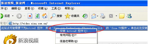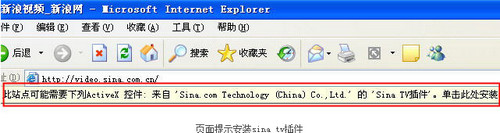 通常的报错还包括以下几种情况: a 视频播放框黑屏、白屏,无内容显示。 b 视频播放框显示“小红叉” c 浏览器地址栏下方出现黄色报警信息,提示要求安装插件。 如果您遇到了上述问题,请您按照以下步骤进行解决: 1、点击浏览器栏的提示,在页面进行sina tv 插件的安装: 请您点击浏览器上方的提示条,然后选择“安装 ActiveX控件”