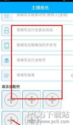 3、在主播报名界面看,输入关联房间号,支付宝真实新密,关联微信手机号,支付宝账号,身高,添加靓照,点击提交并等待审核按钮: