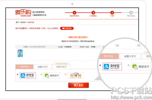5.支付货款 (1)确认无误后点击“去结算”,生成新订单并显示订单编号。跳转至支付选择页面选择支付方式。 (2)订购过程中您可以选择支付平台:支付宝支付、微信支付、财付通支付、储蓄卡支付、信用卡支付。