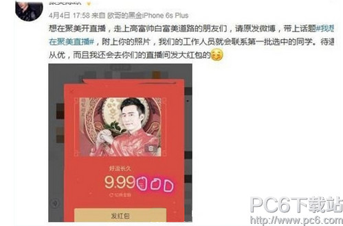 导读想和朋友分享您喜欢的苹果应用? 我想发上微博该是个不错的主意, 更高效的应用平台:App Store浏览太麻烦? 没法找到高质量的应用? 下载苹果应用大全 省时!省力!!省心!搜索功能强大,搜索结果... 想和朋友分享您喜欢的苹果应用? 我想发上微博该是个不错的主意, 更高效的应用平台:App Store浏览太麻烦? 没法找到高质量的应用? 下载苹果应用大全 省时!省力!!省心!搜索功能强大,搜索结果优先列出限免软件和免费软件。 聚美直播怎么开通?聚美直播开通方法介绍。聚美直播是聚美优品全新上线的一个功能,但是聚美直播必须申请才可以直播,想在聚美上直播怎么办呢?聚美直播怎么开通?让小编告诉大家聚美直播开通方法吧。 1、想要在聚美上直播,需要通过申请才可以直播的,聚美ceo陈欧的微博上发的微博:在我想在聚美上直播微博界面,附上你的照片,工作人员将会联系第一批选中的同学,待遇从优,而且我还会去你们的直播间发红包的哟。