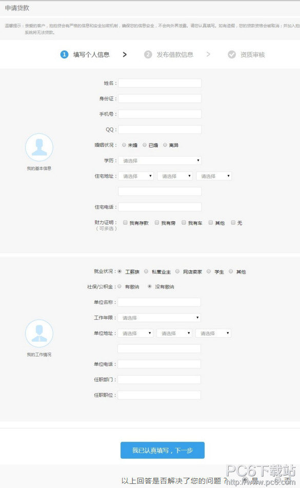 导读想和朋友分享您喜欢的苹果应用? 我想发上微博该是个不错的主意, 更高效的应用平台:App Store浏览太麻烦? 没法找到高质量的应用? 下载苹果应用大全 省时!省力!!省心!搜索功能强大,搜索结果... 想和朋友分享您喜欢的苹果应用? 我想发上微博该是个不错的主意, 更高效的应用平台:App Store浏览太麻烦? 没法找到高质量的应用? 下载苹果应用大全 省时!省力!!省心!搜索功能强大,搜索结果优先列出限免软件和免费软件。 拍拍贷怎么发布贷款信息?拍拍贷贷款资金怎么提现?拍拍贷投资期限自由,是工商部门特批的P2P网络信用借贷平台,如果你想要贷款可以在上面发布贷款信息,但是很多人却不知道拍拍贷怎么发布贷款信息,拍拍贷贷款资金怎么提现,那么拍拍贷怎么发布贷款信息,拍拍贷贷款资金怎么提现,下面pc6小编给你解答。 首先你必须要完善你的个人信息,完成之后将会被引导至发布借款列表页面,请您按照页面提示填写“借款用途”、“借款标题”、“联系人信息”等信息,并上传您的相关资料。借款需求就发布成功了。提交完成后请您保持手机畅通,工作人员将会尽快与您联系。