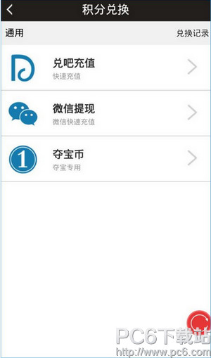 2、进入积分兑换页面,目前支持兑吧充值、微信提现、夺宝币三种提现方式。