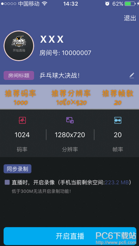 大家登录之后,界面简洁明了,清晰定位,让大家使用起来不存在任何困扰。 然后,还要给大家介绍下,现在大家可以勾选下方的录像功能,这样的话,直播时的录像会自动保存在手机里面,大家可以根据默认保存的路径查询到直播录像。 相关直播参数的选择,大家请根据自身网络条件和摄像头情况合理选择,码率推荐为1000,帧数推荐为20,分辨率1280*920,一般来说,可以照顾到绝大部分的用户需求,直接用起来就好啦!