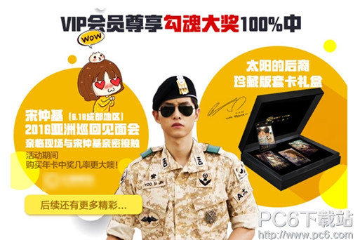 5、实物奖品将在活动结束后14个工作日与中奖者确认信息后寄送。 6、抽中宋仲基见面机会的用户会在活动结束后14个工作日内与中奖者联系确认信息及领取方式(见面会门票档位分为:1088元、880元、580元,届时将会随机发放。见面会日期:2016年6月17日,地点:成都电子科技大学体育馆)。 *中奖用户请认真填写有效信息,方便奖品发放 ps:以上就是pc6小编带来的爱奇艺六周年活动在哪里,爱奇艺买一送一会员活动怎么玩介绍。 苹果应用引领新的上网速度革命,给您带来超快体验。 |