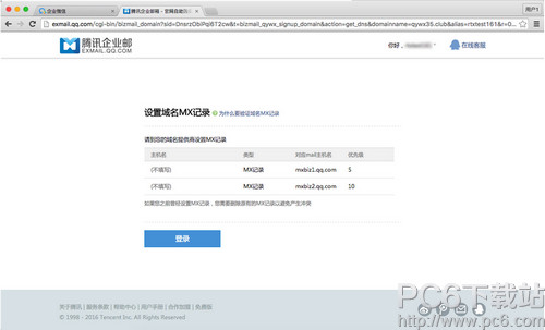 四、设置域名MX记录 使用企业邮箱服务,需到你的域名服务提供商处设置正确的MX记录。 (什么是域名的MX记录及设置方法?) 备注: a、MX生效的时间根据不同的域名服务商而不同,通常需要2-24个小时; b、若上一步提交企业域名已在腾讯企业邮箱中被使用,需要验证域名的所有权。(什么是域名的所有权及设置方法?)
