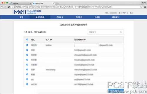 七、通讯录导入完成 企业微信的全部通讯录都导入到腾讯企业邮箱中。 已经开通的帐号会通过企业微信通知账号和密码,员工可以正常地使用企业邮箱。 未开通的员工不能使用企业邮箱。 备注:未开通的帐号不占用名额。