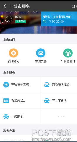 然后进入城市服务,如果有实时路况点击实时路况,如果没有点击关注宁波交警: