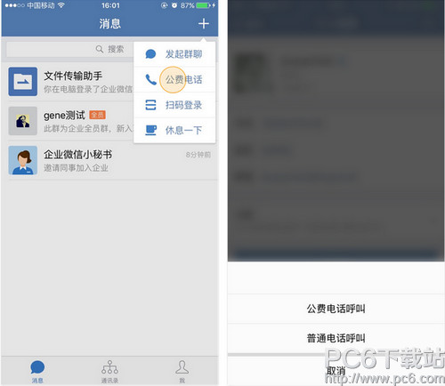 4、点击会话消息里提到的手机号码,在弹出菜单里选择“公费电话呼叫”。
