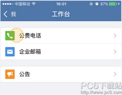 2、“我-工作台”中点击“公费电话”,进入公费电话主界面,拨打操作同上;