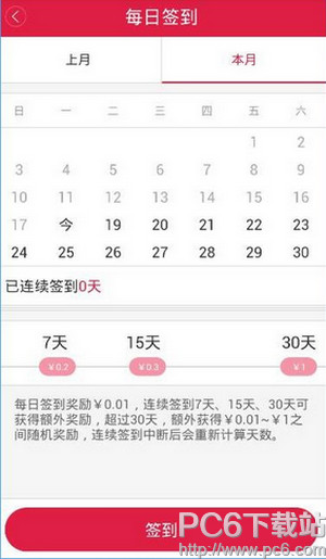 3、每日签到 每日签到会获得基础奖励0.01元,连续签到7天、15天、30天时,除基础奖励外还会分别获得一个额外奖励0.2元、0.3元、1元,连续签到30天后,除基础奖励外还会获得一个额外的随机奖励,随机金额从0.01元到1元不等。