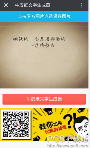 导读想和朋友分享您喜欢的苹果应用? 我想发上微博该是个不错的主意, 更高效的应用平台:App Store浏览太麻烦? 没法找到高质量的应用? 下载苹果应用大全 省时!省力!!省心!搜索功能强大,搜索结果... 想和朋友分享您喜欢的苹果应用? 我想发上微博该是个不错的主意, 更高效的应用平台:App Store浏览太麻烦? 没法找到高质量的应用? 下载苹果应用大全 省时!省力!!省心!搜索功能强大,搜索结果优先列出限免软件和免费软件。 牛皮纸文字生成器怎么玩?牛皮纸文字生成器在哪里?牛皮纸文字有种复古唯美的感觉,所以很多朋友喜欢把你自己的表白和感受写在上面,但是很多人不知道牛皮纸文字生成器在哪里?牛皮纸文字生成器怎么玩,今天pc6小编教教大家牛皮纸文字生成器怎么玩?牛皮纸文字生成器在哪里? 首先扫面下方二维码,关注公众号: