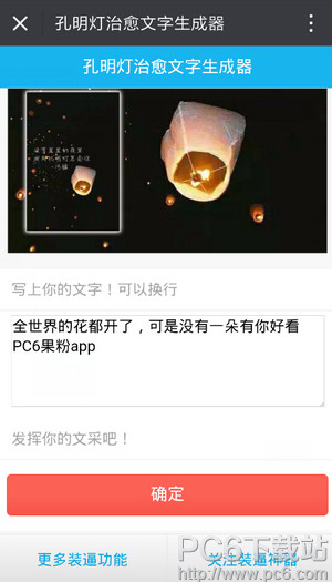 导读想和朋友分享您喜欢的苹果应用? 我想发上微博该是个不错的主意, 更高效的应用平台:App Store浏览太麻烦? 没法找到高质量的应用? 下载苹果应用大全 省时!省力!!省心!搜索功能强大,搜索结果... 想和朋友分享您喜欢的苹果应用? 我想发上微博该是个不错的主意, 更高效的应用平台:App Store浏览太麻烦? 没法找到高质量的应用? 下载苹果应用大全 省时!省力!!省心!搜索功能强大,搜索结果优先列出限免软件和免费软件。 孔明灯图片上的文字怎么制作?孔明灯图片上的文字制作教程?时下很多朋友在朋友圈发放孔明灯的照片,吸引了一波点赞党,而且文字优美,照片漂亮,但是很多朋友不知道这是怎么制作的,不知道孔明灯上的文字制作方法,下面pc6小编教大家孔明灯图片上的文字怎么制作?孔明灯图片上的文字制作教程? 打开微信,扫描下方二维码,点击关注: