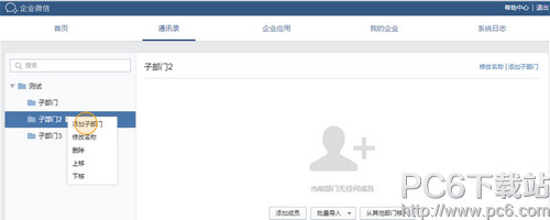 二、添加部门 点击“通讯录”的部门旁的三角符号或者在成员列表右上角进行添加子部门。与此同时还提供了修改部门名称、调整部门顺序等操作。