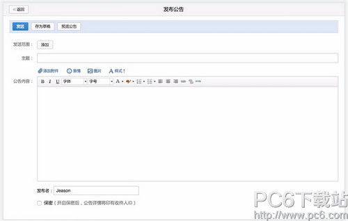3)进入写公告页面后,可以编辑公告内容并发布 1. 公告可填写内容包括:发送范围(来自组织架构)、主题、附件、公告内容、发布者(默认为当前登录者)、保密状态(开启保密后公告详情将印有收件人ID); 2. 支持预览公告,并将公告发送到自己手机上; 3. 支持将公告存为草稿,下次继续编辑。