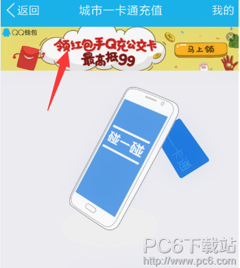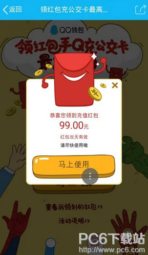 4、在城市一卡通充值活动入口就可以看到领红包手Q充公交卡页面: