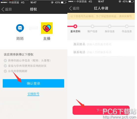 2、这个时候,我们需要将陌陌和红人直播间授权,然后填写基本资料、身份证信息、作品信息,申请红人后,我们就可以当主播啦!