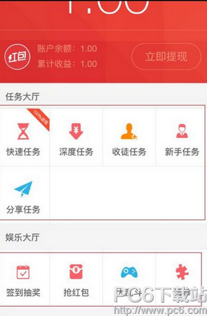 2、即进入到红包达人界面,在红包达人主界面,用户可以通过任务大厅及娱乐大厅来赚钱哟,而任务大厅包括快速任务、深度任务、收徒任务、新手任务及分享任务,娱乐大厅包括签到抽奖、抢红包、大乱斗和猜拳等任务,只要按提示一步步操作即可快速赚钱哟。