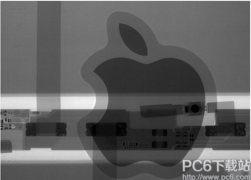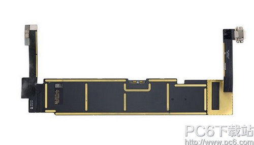 3、我们先看看9.7寸iPad Pro在X光线下的样子。Creative Electron 提供的X射线下的9.7 英寸 iPad Pro。12.9 英寸 iPad Pro 机身中四个扬声器占据了不少空间。但是在 9.7 英寸版本中,电池占据的空间比例才是最大的,逻辑板都被挤到一边了,扬声器更是被放到了角落上。中间印刷电路板上有一道很奇怪的东西是什么?只能通过拆解来看看了。