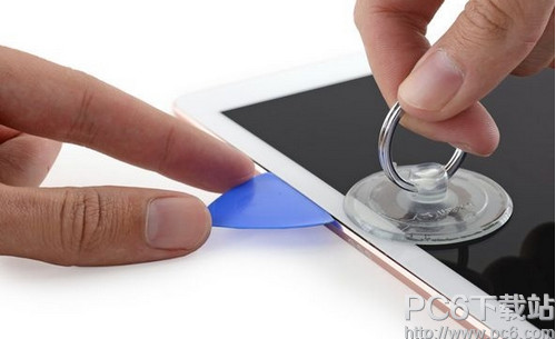 拆机评测: 1、此次拆机的9.7寸iPad Pro是一款粉色机型。9.7寸iPad Pro和12.9英寸版本的iPad Pro不同,这款iPad Pro 的摄像头突出来1.1mm,这或许是无法避免的,因为后壳更薄了,而且摄像头的规格也升级到了1200万像素。在它的玫瑰金外壳上我们看到这款新设备的型号为A1673。