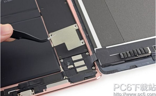 6、起螺丝后把改在逻辑板上的EMI屏蔽保护层移开。12.9 英寸 iPad Pro 中也有这么一层屏蔽层,但是 iPad Air 产品线中并没有。接下来是把电池和逻辑板分离。电池板上还覆盖着一层屏蔽保护层,位于两个电池单元之间。这里有点奇怪,好像是有螺丝钉将 Smart Keyboard connector 固定到电池板上。
