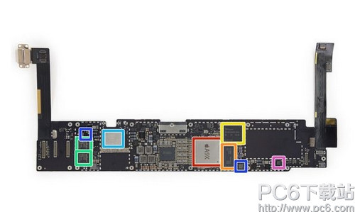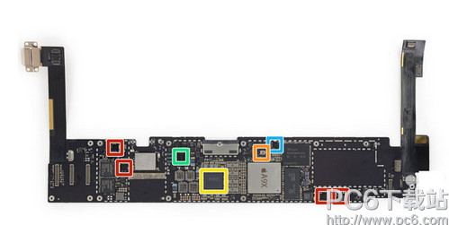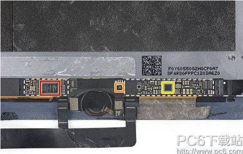 5、后盖拆开后,我们可以看到屏幕缆线在右下角,这是第一次看到苹果采用这样的布局方式。屏幕背部有很多衬垫泡沫,还有很多芯片: 红:Parade Technologies DP815 (可能是 12.9 英寸版本中 DP695 时序控制器的另一代产品) 橙:NXP Semiconductors 8416A1 Touch ID 传感器 黄:98667A B5528T