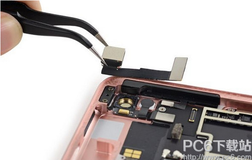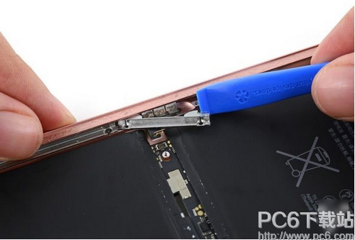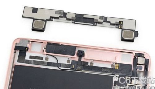 7、各种保护层和线路断连之后,我们先看看位于机身上部的扬声器系统。苹果不仅用胶水和螺丝钉把它固定得非常稳固。扬声器和逻辑板是通过弹簧触点连接的。