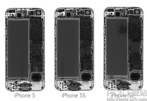 7.此时看下iPhone se与以往iPhone的对比。Creative Electron 提供的 X 射线下 iPhone 5、iPhone 5s 以及 iPhone SE 的对比。最明显的就是多了不锈钢抛光镶嵌的背部 logo。还有就是 iPhone 5 和 iPhone 5s 的 Touch ID 差别。