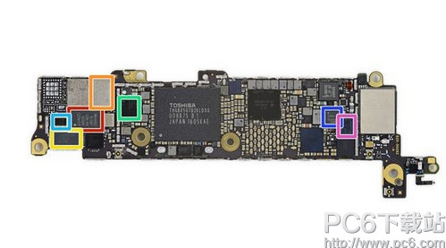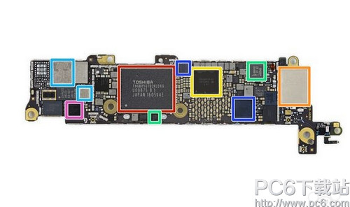 芯片部分: 红:Avago ACPM-8020 中频段功率放大器双工器 (和 iPhone 6 中的一样) 橙:Quorvo (TriQuint) TQF6410 低频段功率放大器双工器(和 iPhone 6 Plus 中的一样) 黄:TDK EPCOS D5255 分集接收模块 绿:Qualcomm PM8019 PMIC(和 iPhone 6/6 Plus 中的一样) 青:Quorvo (RF Micro Devices) RF5159 天线开关模块(和 iPhone 6/6 Plus 中的一样) 蓝:InvenSense EMS-A 六轴陀螺仪和加速度计组合 紫:Broadcom BCM5976 触摸屏控制器(和 iPhone 5 中的一样)
